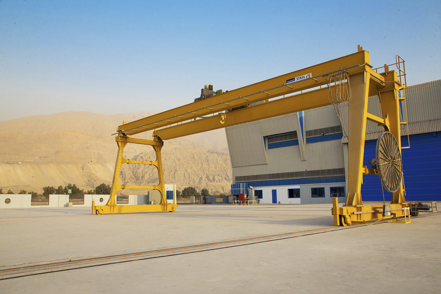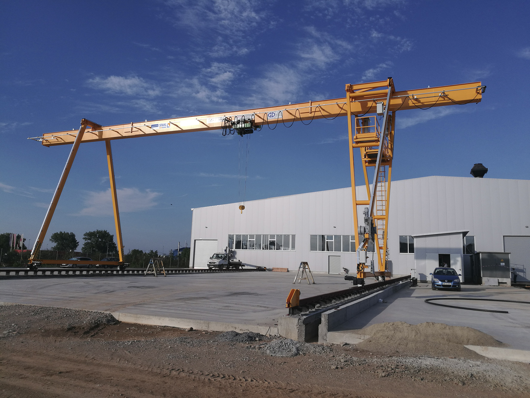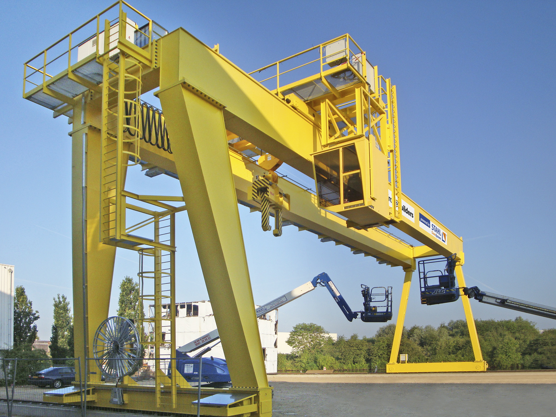 Dieser typische Kran ist wie ein Tor gebaut, Schienenlaufbahn / Gleislaufbahn auf der Erde (Flur) gebaut oder Gleislose Portalkrane auf Räder/Raupenwerk. Der Portalkran überspannt seinen Arbeitsbereich wie ein Portal. Er läuft meistens auf zwei parallelen Schienen, auf denen er sich mit seinen Stützen abstützt. Dadurch unterscheidet er sich von einem Brückenkran, der auf aufgeständerten Schienen läuft. Das Portal ist eine Stahlkonstruktion, die meistens in Fachwerk- oder Rahmenbauweise ausgeführt ist. Der Kran hat jeweils eine Pendelstütze und eine starre Stütze, um die temperaturbedingte Längenänderung der Kranbrücke (horizontaler Teil des Portals) auszugleichen. Längs der Kranbrücke verfährt die Laufkatze mit dem Hubwerk. Es kann aber auch ein Schienendrehkran auf der Kranbrücke montiert sein. Die Schienen können frei verlegt oder im Boden versenkt sein. Die Stromzuführung erfolgt in der Regel über eine Motor- oder Federleitungstrommel, eine Schleifleitung, eine Schleppkabelanlage oder über Schleifkontakte im Boden. Das Laufwerk des Portals muss auf beiden Seiten gleiche Wege zurücklegen, um Verkanten zu vermeiden. Die Räder müssten eigentlich durch eine starre Welle verbunden sein, es wird aber eine elektrische Welle verwendet. Dabei wird jedes Rad von einem Schleifringläufermotor angetrieben. Die Motoren haben einen gemeinsamen Läuferkreis, dadurch sind die Schlupffrequenzen und auch die Drehzahlen gleich. Die beiden Motoren wirken wie zwei Synchronmaschinen, die mit einer veränderbaren Frequenz gespeist werden. Die elektrische Welle hat sogar die Neigung zum Pendeln von der Synchronmaschine geerbt. Durch ihre Bauart können Portalkräne zwischen den Stützen sehr große Lasten heben. Da die Stützen senkrecht belastet werden, ist in erster Linie die maximale Biegebeanspruchung der Kranbrücke und die Hubleistung des Seilhubwerks für die maximal mögliche Belastung ausschlaggebend. Es ist auch kein Gegengewicht notwendig, wenn die Kranbrücke nicht über die Stützen hinausragt. Dieses ist aber oft der Fall bei Portalkränen in Hafenanlagen, dort stellt die Schiene auf der Kaimauer sehr hohe Anforderungen an diese, da diese Stütze am meisten belastet wird. Je nach Auslegerlänge kann ein Zusatzgewicht auf der abgewandten Seite notwendig sein, dieses wird meistens in das Laufwerk der Stütze eingebaut. Der Portalkran kann die Last in allen drei Richtungen bewegen. (Quelle Wikipedia)