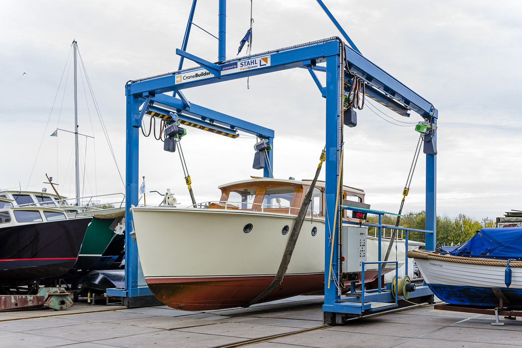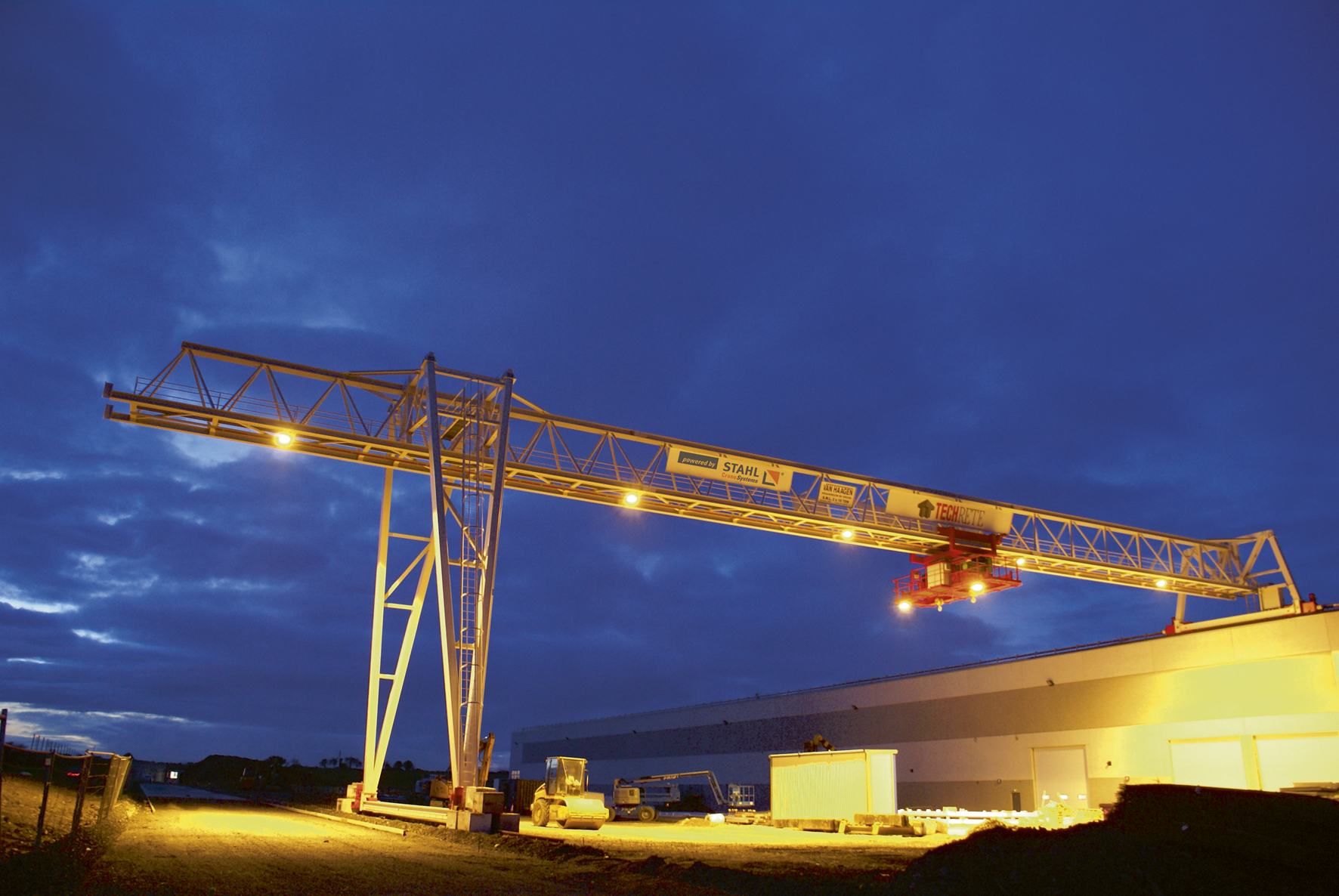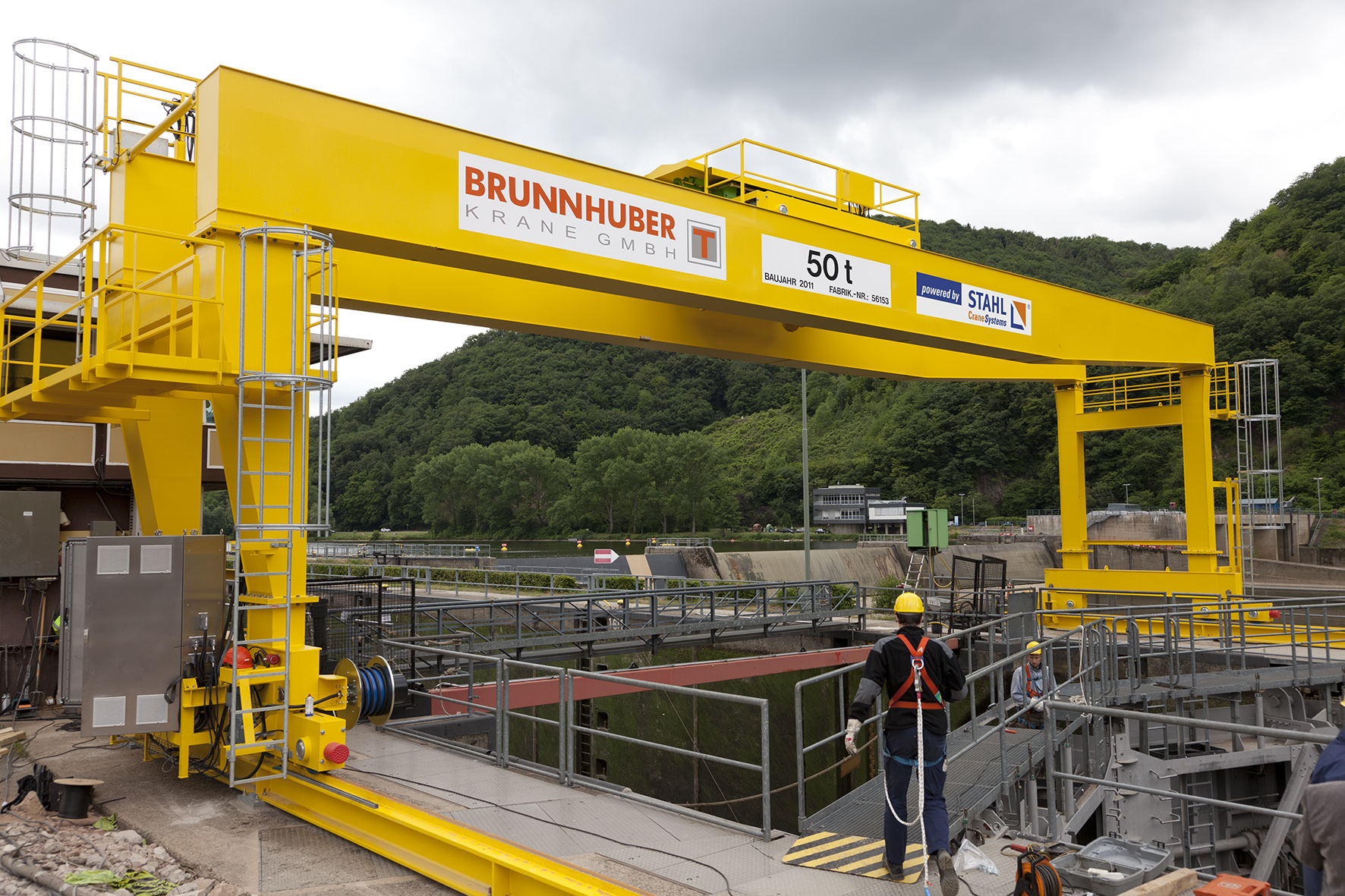 Dieser typische Kran ist wie ein Tor gebaut, Schienenlaufbahn / Gleislaufbahn auf der Erde (Flur) gebaut oder Gleislose Portalkrane auf Räder/Raupenwerk. Der Portalkran überspannt seinen Arbeitsbereich wie ein Portal. Er läuft meistens auf zwei parallelen Schienen, auf denen er sich mit seinen Stützen abstützt. Dadurch unterscheidet er sich von einem Brückenkran, der auf aufgeständerten Schienen läuft. Das Portal ist eine Stahlkonstruktion, die meistens in Fachwerk- oder Rahmenbauweise ausgeführt ist. Der Kran hat jeweils eine Pendelstütze und eine starre Stütze, um die temperaturbedingte Längenänderung der Kranbrücke (horizontaler Teil des Portals) auszugleichen. Längs der Kranbrücke verfährt die Laufkatze mit dem Hubwerk. Es kann aber auch ein Schienendrehkran auf der Kranbrücke montiert sein. Die Schienen können frei verlegt oder im Boden versenkt sein. Die Stromzuführung erfolgt in der Regel über eine Motor- oder Federleitungstrommel, eine Schleifleitung, eine Schleppkabelanlage oder über Schleifkontakte im Boden. Das Laufwerk des Portals muss auf beiden Seiten gleiche Wege zurücklegen, um Verkanten zu vermeiden. Die Räder müssten eigentlich durch eine starre Welle verbunden sein, es wird aber eine elektrische Welle verwendet. Dabei wird jedes Rad von einem Schleifringläufermotor angetrieben. Die Motoren haben einen gemeinsamen Läuferkreis, dadurch sind die Schlupffrequenzen und auch die Drehzahlen gleich. Die beiden Motoren wirken wie zwei Synchronmaschinen, die mit einer veränderbaren Frequenz gespeist werden. Die elektrische Welle hat sogar die Neigung zum Pendeln von der Synchronmaschine geerbt. Durch ihre Bauart können Portalkräne zwischen den Stützen sehr große Lasten heben. Da die Stützen senkrecht belastet werden, ist in erster Linie die maximale Biegebeanspruchung der Kranbrücke und die Hubleistung des Seilhubwerks für die maximal mögliche Belastung ausschlaggebend. Es ist auch kein Gegengewicht notwendig, wenn die Kranbrücke nicht über die Stützen hinausragt. Dieses ist aber oft der Fall bei Portalkränen in Hafenanlagen, dort stellt die Schiene auf der Kaimauer sehr hohe Anforderungen an diese, da diese Stütze am meisten belastet wird. Je nach Auslegerlänge kann ein Zusatzgewicht auf der abgewandten Seite notwendig sein, dieses wird meistens in das Laufwerk der Stütze eingebaut. Der Portalkran kann die Last in allen drei Richtungen bewegen. (Quelle Wikipedia)